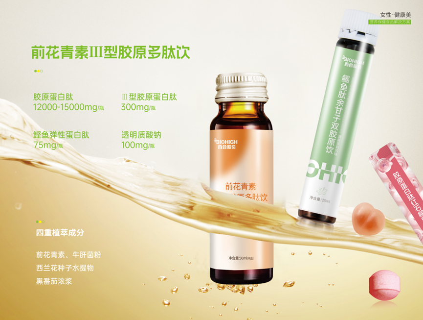 (上下滑动,查看更多产品) 前花青素Ⅲ型胶原多肽饮 人体衰老表现为真皮层的胶原蛋白流失,胶原蛋白的含量随着年龄增长而不断流失。25岁之后胶原蛋白开始加速流失,其中III型胶原蛋白流失速度比I型胶原蛋白更快。 目前市场中,饮品为当下最主流的口服胶原蛋白肽产品形态。百合股份作为营养保健食品行业的头部企业,针对消费者普遍痛点及考虑因素,配方创新,使用前瞻性原料打造一款——“前花青素Ⅲ型胶原多肽饮”。采用了双胶原配方,Ⅰ型和Ⅲ型同时补充,胶原含量达到15000mg/瓶 ,同时添加了海岸松来源的前花青素及牛肝菌粉等多重植萃成分,含有弹性蛋白和透明质酸钠,维生素的添加也采用了经典的ACE组合,帮助达成消费者内调外养的需求。
