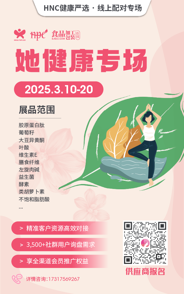 3月10-20日,HNC健康严选将打造“她健康”主题专场,通过聚合行业力量深化“女性健康”领域布局,为健康企业搭建集产品展示、趋势洞察、供需对接于一体的轻量化平台,助力品牌精准触达目标用户,在专业赛道中抢占价值高地,实现从产品力到市场影响力的全链路升级。