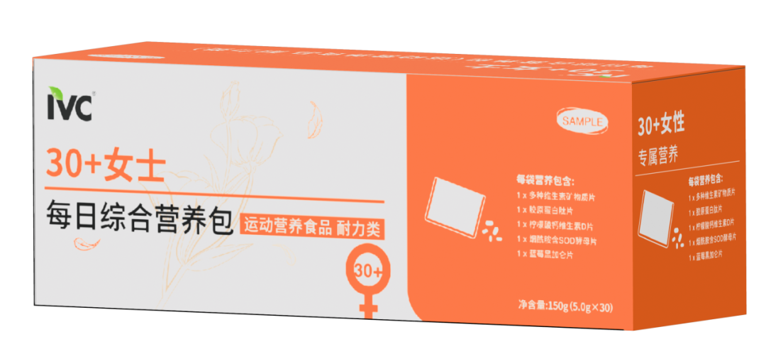 IVC 每日营养包产品系列 30+女性每日营养包 基础养护:多种维矿 焕发光彩:胶原蛋白,烟酰胺SOD酵母 骨骼营养:柠檬酸钙 润养双眼:蓝莓黑加仑