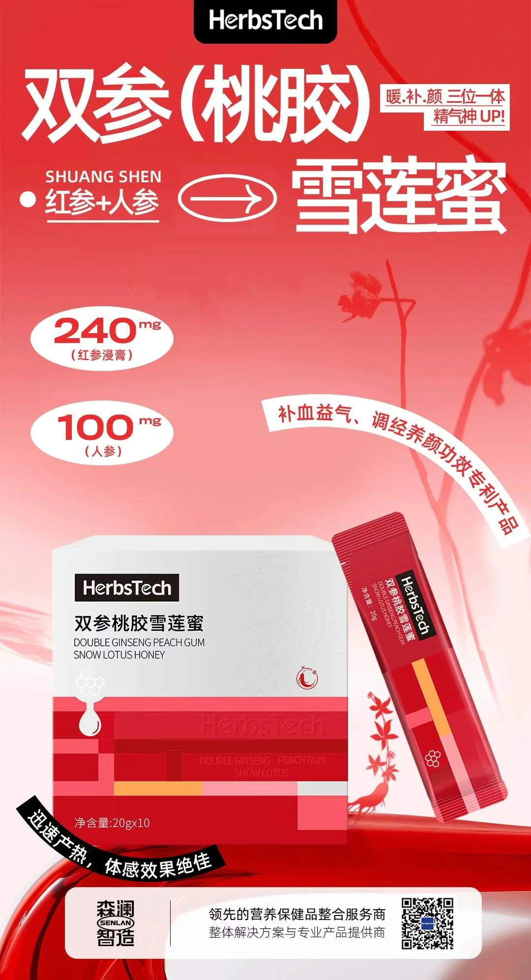 双参桃胶雪莲蜜 女子以血为本,一生中耗血失血比男性要更多,对于女性而言,气血更为重要。数据显示,气血健康消费者超七成为女性,年龄段集中在30-40岁的中青年阶段,产品效果是消费者选购产品的首要考虑因素。针对消费者普遍痛点及考虑因素,森澜精心打造了一款集“暖、补、颜”三位一体的产品——“双参桃胶雪莲蜜”,旨在满足气血两亏、肝肾阴虚、月经不调等人群的不同需求。双参桃胶雪莲蜜满足了成分党追求“一瓶多补”的需求,在补益气血的基础上,还添加了7种植物精粹,帮助对抗肌肤糖化、氧化问题。