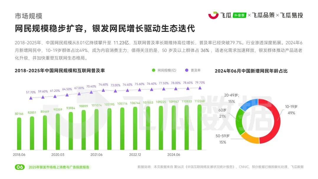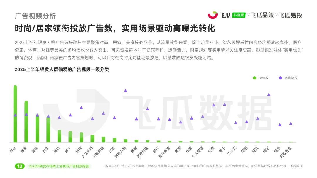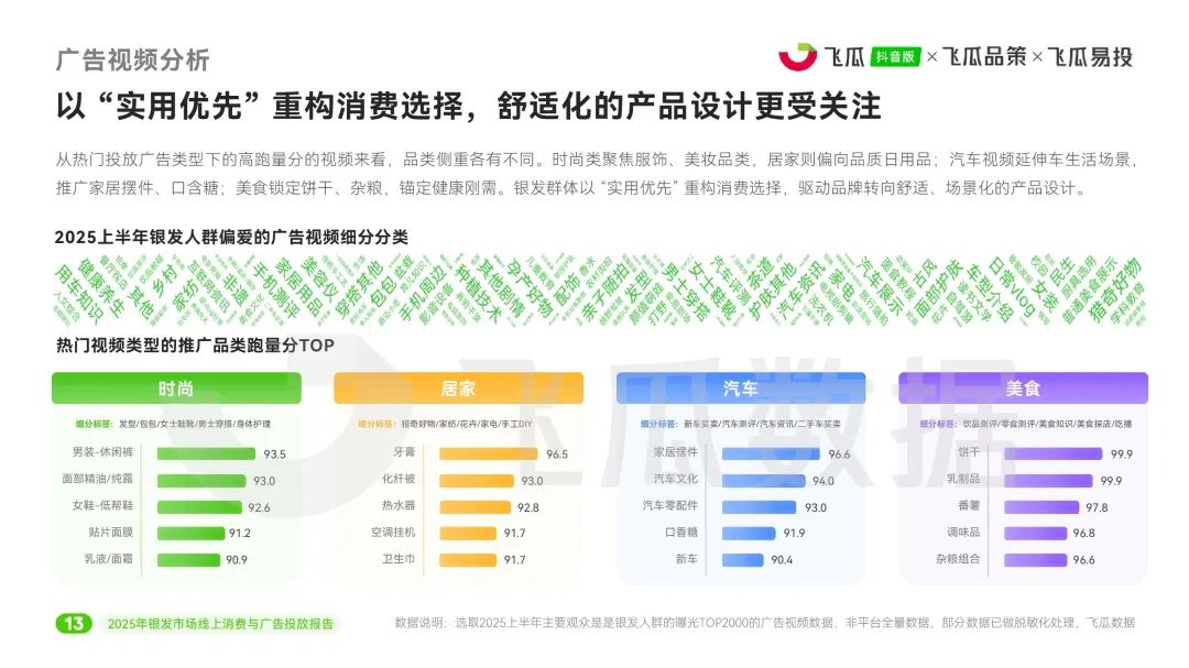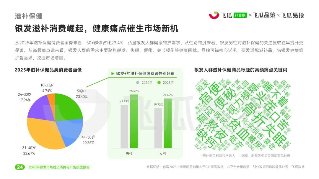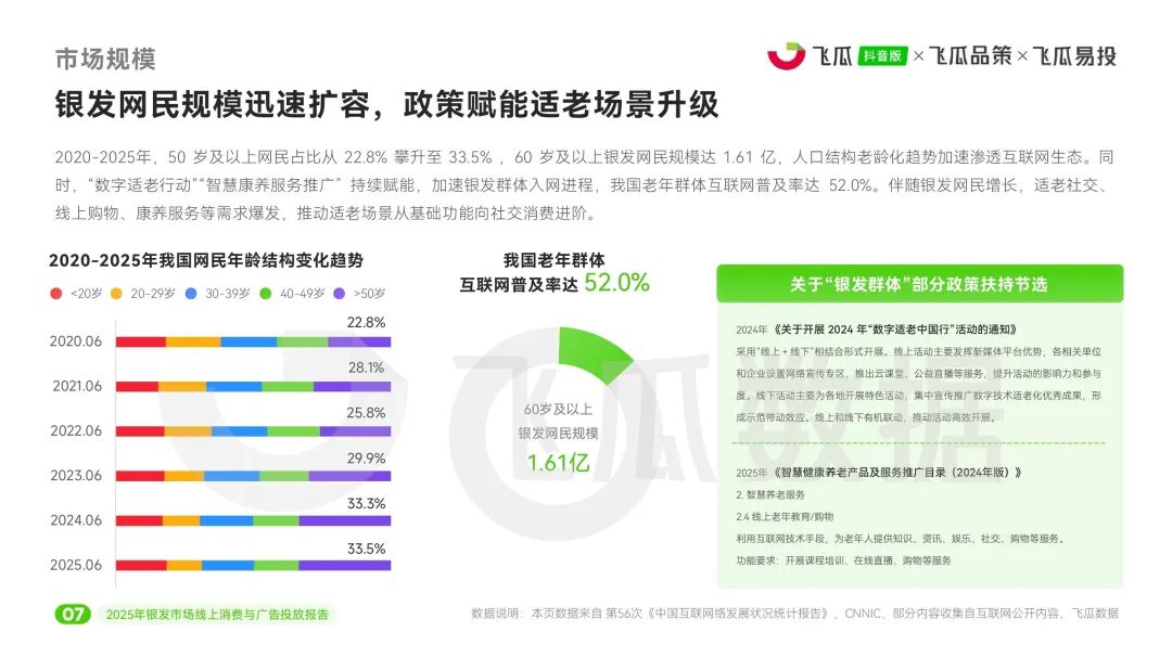 近日,飞瓜数据推出《2025年飞瓜抖音银发市场线上消费与广告投放报告》,深入剖析了中国银发群体(50岁及以上)在抖音平台的消费行为与营销趋势。整体上,银发市场正从基础功能消费向品质化、场景化、情感化进阶,为品牌带来细分增长新机遇。