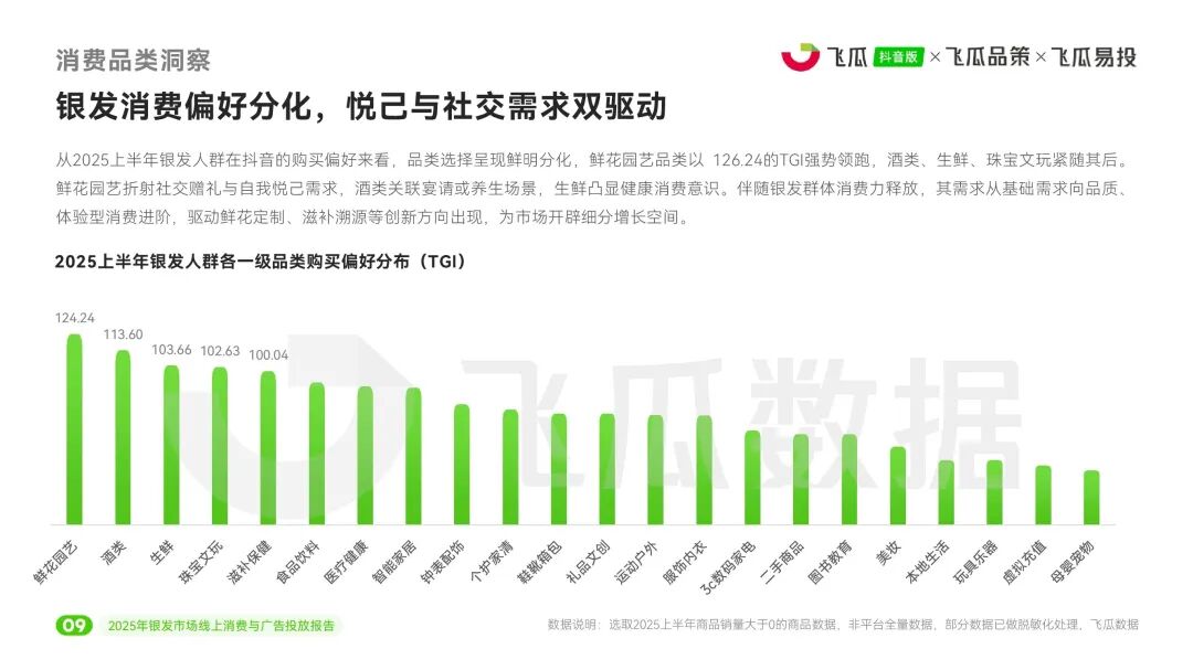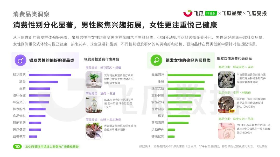 消费偏好方面,银发群体呈现出鲜明分化特征。鲜花园艺、酒类、生鲜、珠宝文玩成为最受青睐的品类,TGI指数居高。其中,性别差异显著:男性更关注兴趣社交(如绿植、白酒),女性则侧重悦己与健康(如花卉、滋补品、珠宝),反映出“实用优先”与“品质体验”双驱动的消费心态。