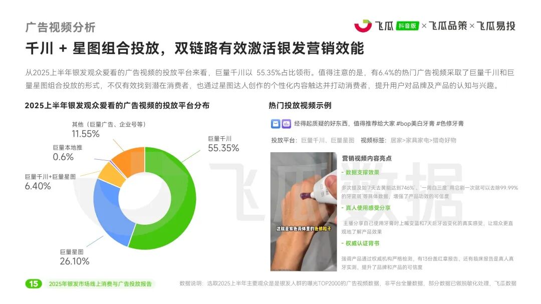 广告投放洞察显示,银发群体偏爱时尚、居家、美食类内容,但医疗健康、体育、财经等实用型品类条均播放量突出。巨量千川是主要投放平台(占比55.35%),而“千川+星图”组合投放模式(占比6.4)通过达人个性化内容有效提升品牌认知与兴趣。热门广告常以场景化演示(如空调房披肩)或情感叙事(如母亲节礼物)切入,激发共鸣并促进转化。
