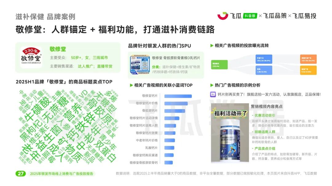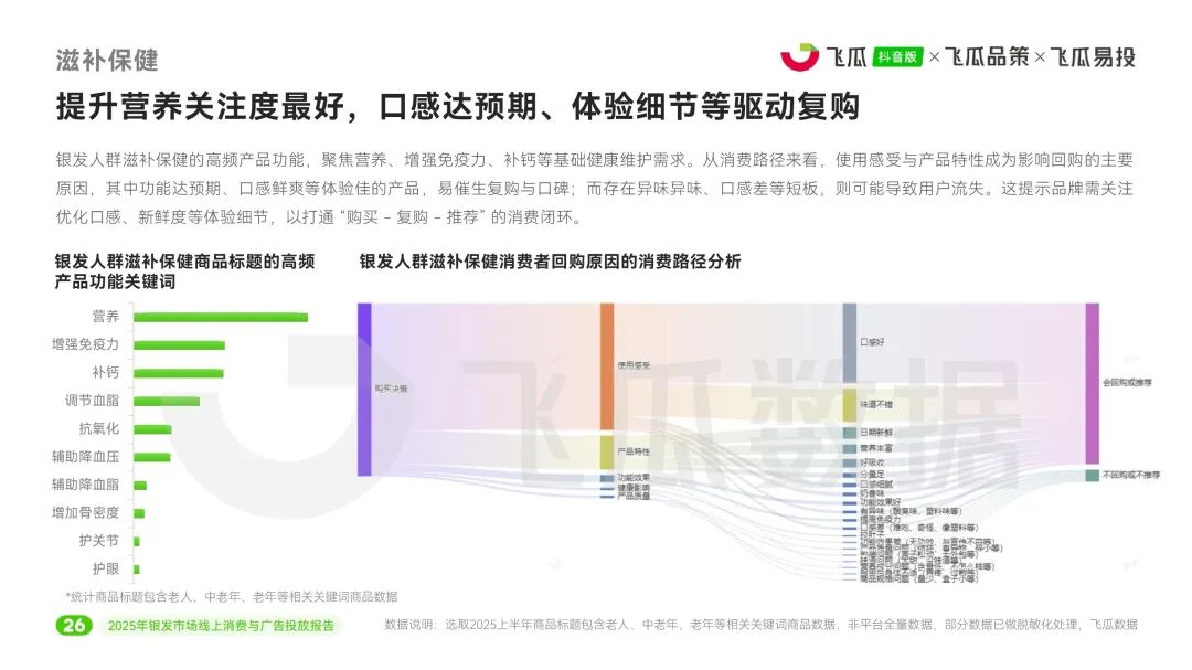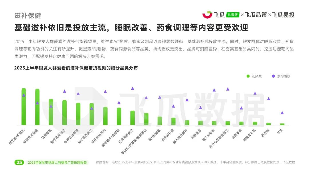 在滋补保健这一重点品类中,健康痛点(脱发、失眠、关节损伤)催生靶向需求。维生素、蜂蜜为基础畅销品类,但褪黑素、药食同源食品等条均播放表现更佳。复购关键取决于口感、新鲜度等体验细节。银发营销需精准锚定人群、结合实用场景与情感共鸣,并通过“功能+体验”优化驱动长效转化。