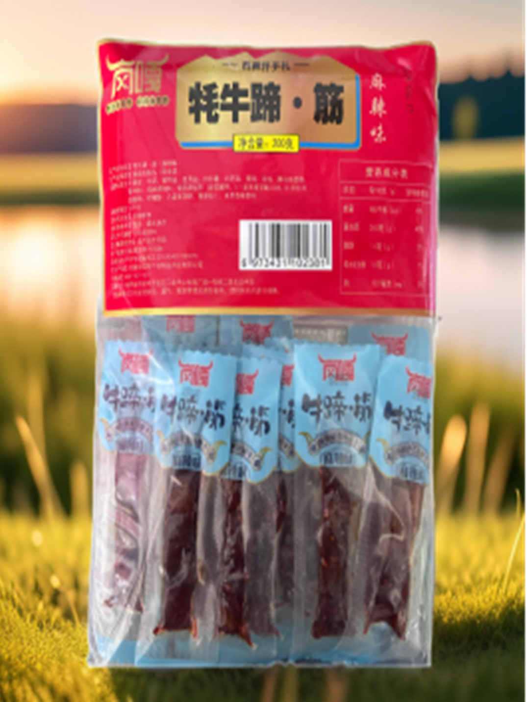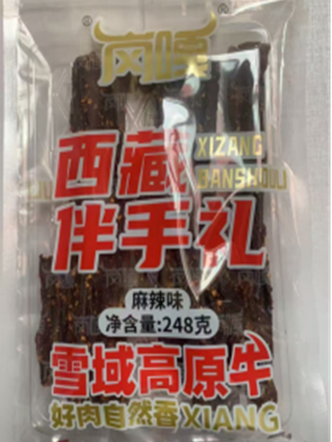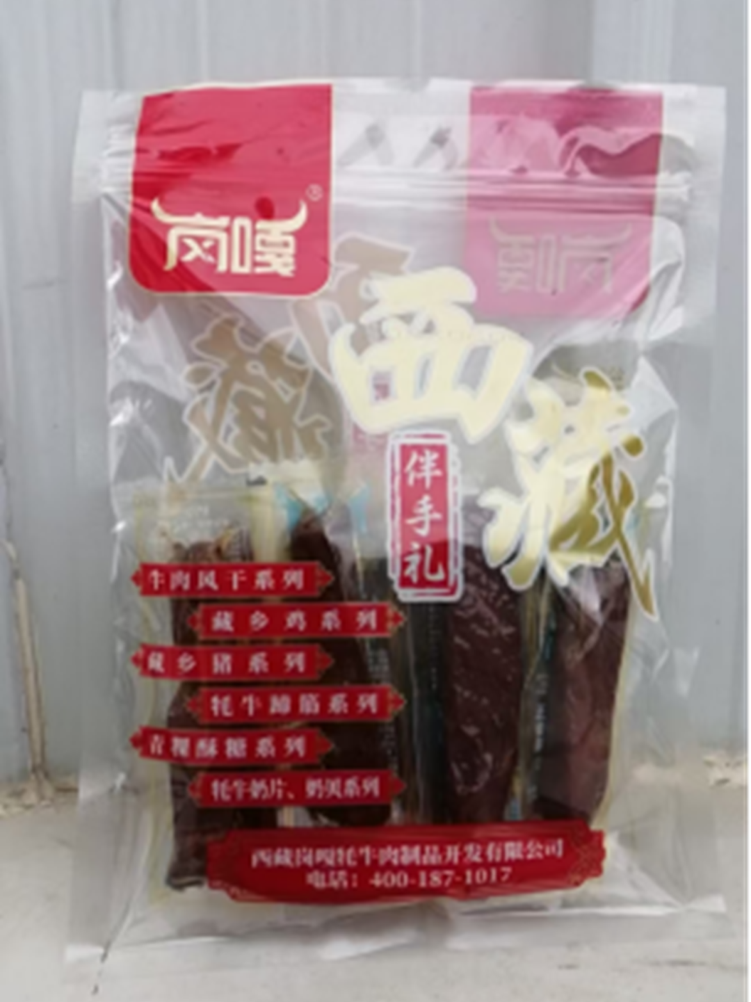 1、风干牦牛肉:选取牦牛后腿肉为原料,经分割、腌制、拌料、低温烘烤而成。 2、手撕牦牛肉:选取牦牛后腿,分割成块状腌制,卤制,拌料等一些列工艺而成。 3、牦牛蹄·筋:选取牛蹄皮、牛筋经卤制,拌料等一些列工艺而成。