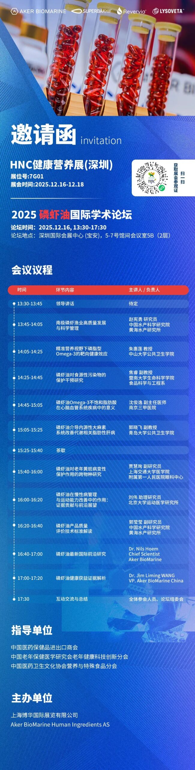 为积极响应《“健康中国2030”规划纲要》所倡导的“共建共享、全民健康”战略导向,深度践行“预防为主、营养先行”的核心原则,直面人类慢性病防控与全生命周期营养健康管理的重大公共需求,本次论坛以“磷虾油国际前沿研究与产业发展趋势”为主题,旨在构建一个全球性的对话平台,汇聚产学研顶尖力量,共同推动磷虾油领域的科学共识与产业协同。 本次论坛以“磷虾油国际前沿研究与产业发展趋势”为主题,将聚焦南极资源可持续管理、国际临床循证新突破、磷脂型Omega-3作用机制及全球标准互认等核心议题。致力于促进前沿科研成果向高标准、高价值产品的转化,引导全球产业链向科学化、透明化与规范化发展,为人类全生命周期的精准营养提供坚实支撑,共同引领全球营养健康产业迈向高质量、可持续的未来。