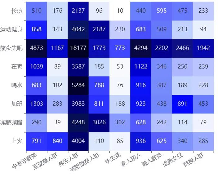通过人群×场景的交叉热力图可清晰发现,熬夜失眠是养生饮品的核心消费场景,且用户高度聚焦有明确健康调理需求的养生人群,场景与人群的绑定度极高。