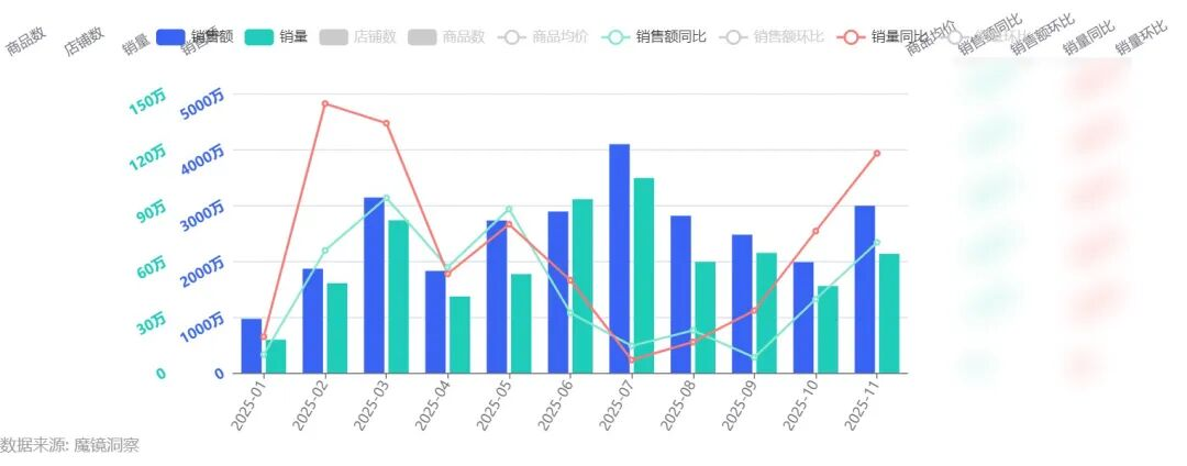 魔镜分析+ 监测数据显示,2025年1-11月,主流电商平台中果子熟了在五指毛桃赛道表现亮眼,销售额达671.79 万元,同比增速飙升至 1724.2%,凭借对年轻群体养生需求的深刻洞察,快速抢占赛道红利。