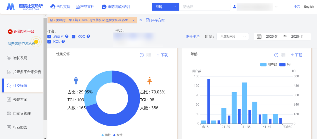 本文涉及的养生水相关数据,均来源于魔镜分析+ 监测的2025年1月-11月主流电商平台数据;成分维度选取逻辑为:选取电商平台养生水商品标题中高频出现的成分词,结合已纳入药食同源目录的成分作为分析对象,并通过气泡图呈现其销售额、增速、商品数等市场表现指标,为后续成分格局、品牌布局等内容提供数据支撑。