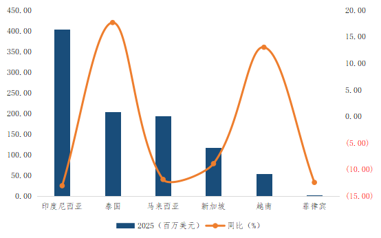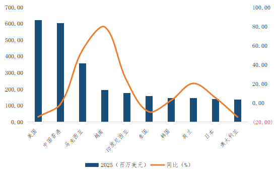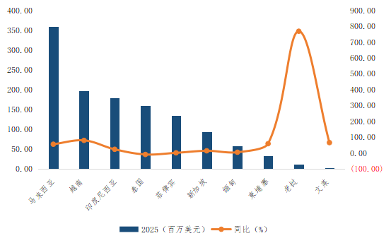 东盟成为增长引擎。2025年中国对东盟十国出口额达12.26亿美元,同比增长28.2%,成为最重要的贸易顺差区域。其中,排名前三位的出口目的地是马来西亚(3.59亿美元)、越南(1.97亿美元)和印度尼西亚(1.79亿美元)。出口至马来西亚和越南的总金额在2025年分别同比大幅增长55.2%和79.5%,使得马、越两国成为中国第三、第四大出口市场。除泰国外,中国对其它东盟国家的出口都较2024年有不同程度的增长。