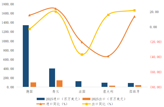 图2:2025年营养保健食品中国与欧盟主要国家进出口情况