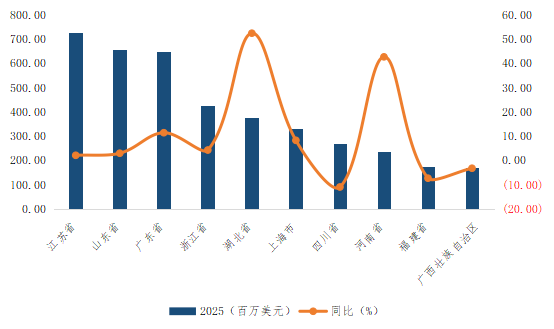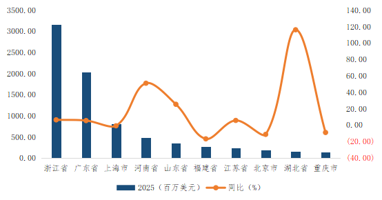中西部地区正快速崛起为新的增长极。河南省和湖北省同比大幅增长,成为全国增长的重要拉动力量。海南省依托自贸港的政策红利,实现了爆发式增长。全年出口额虽然基数仅为0.56亿美元,但同比增速高达43.9%,政策效应正在加速转化为贸易实绩。