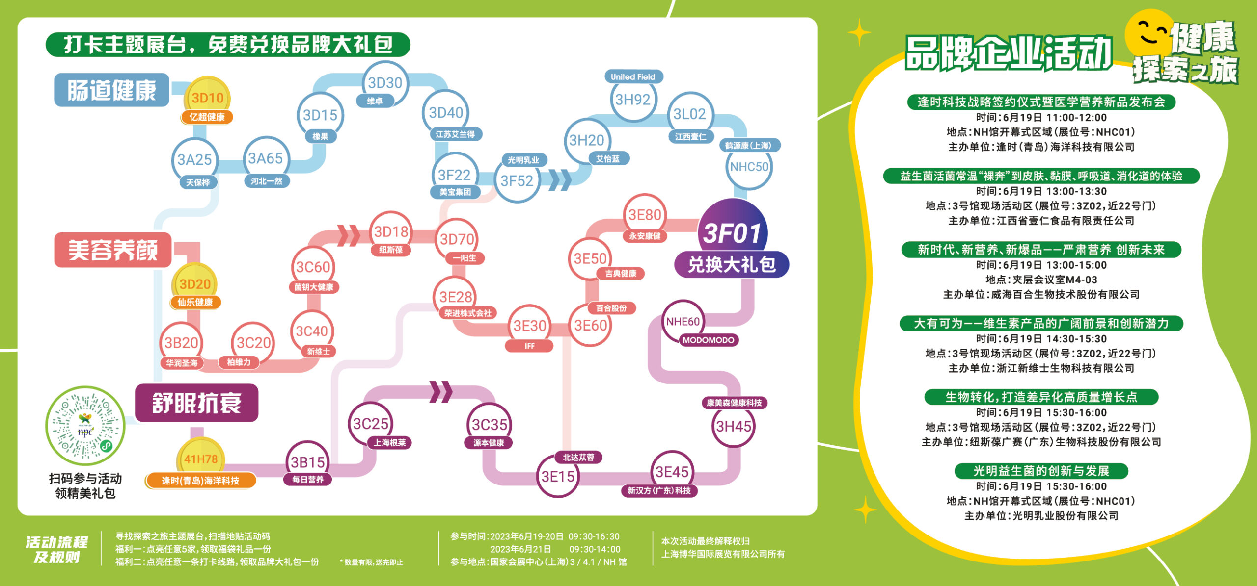 HNC健康营养展结合行业热门领域产品,划分出??运动营养??舒眠抗衰?两大探索之旅主题参观路线,并结合行业技术论坛及新产品新技术发布活动,甄选出20余家优质展商,让您第一时间触达相关产品,与展商进行商贸洽谈。与此同时,在高效沟通的洽谈现场,观众通过打卡,即可解锁两大主题路线所有展台,完成“打卡”任务参与价值百元福袋礼品抽奖。